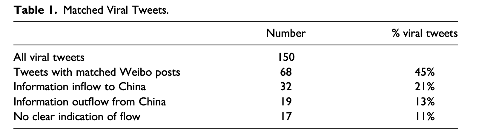 在 150 条走红的 tweets 中,基于 Weibo-COV dataset,我们的系统识别出 66 条至少与一条 Weibo 帖子匹配的 tweets(see Table 1)。使用预审查阶段的 Weiboscope data 进行稳健性检验又得到 2 组额外的共现配对,使总数达到 68(see SI for details)。对全部 68 条匹配 tweets 进行深入调查后,我们发现其中有 32 条体现了信息向中国的流入(inflow of information to China),另有 19 条体现了信息由中国向外的流出(outflow of information from China)。