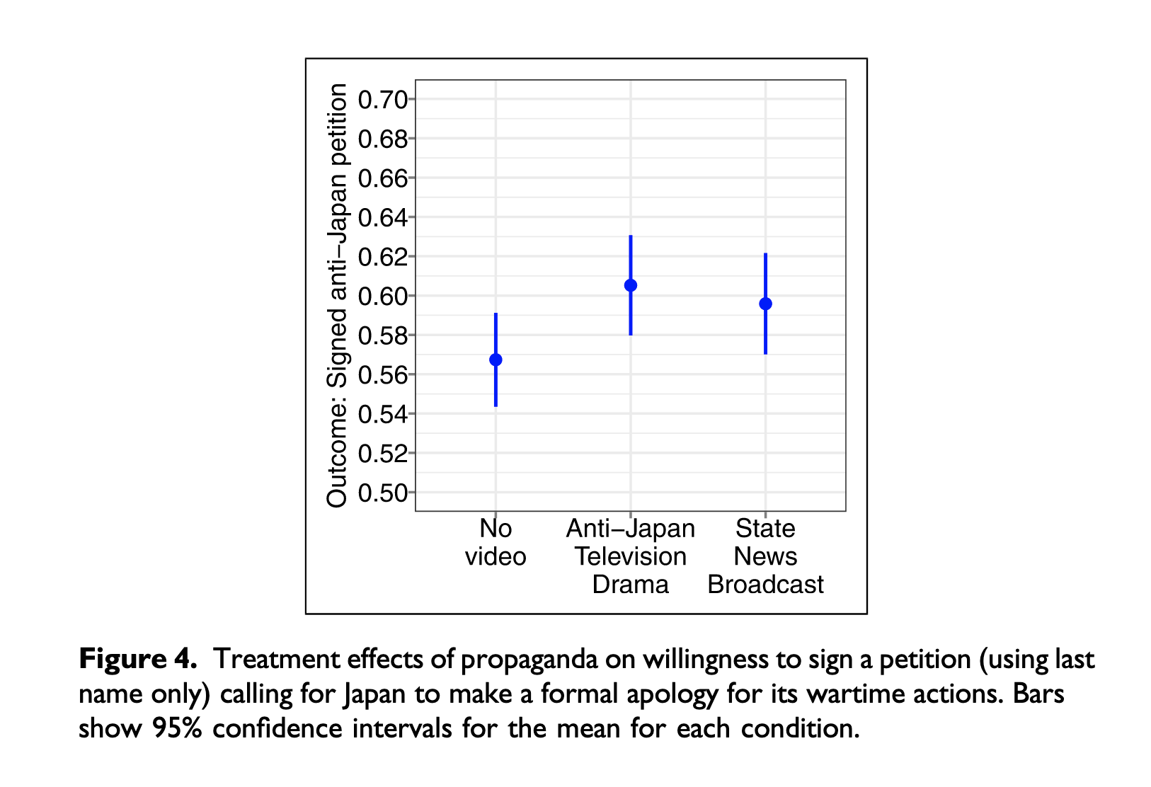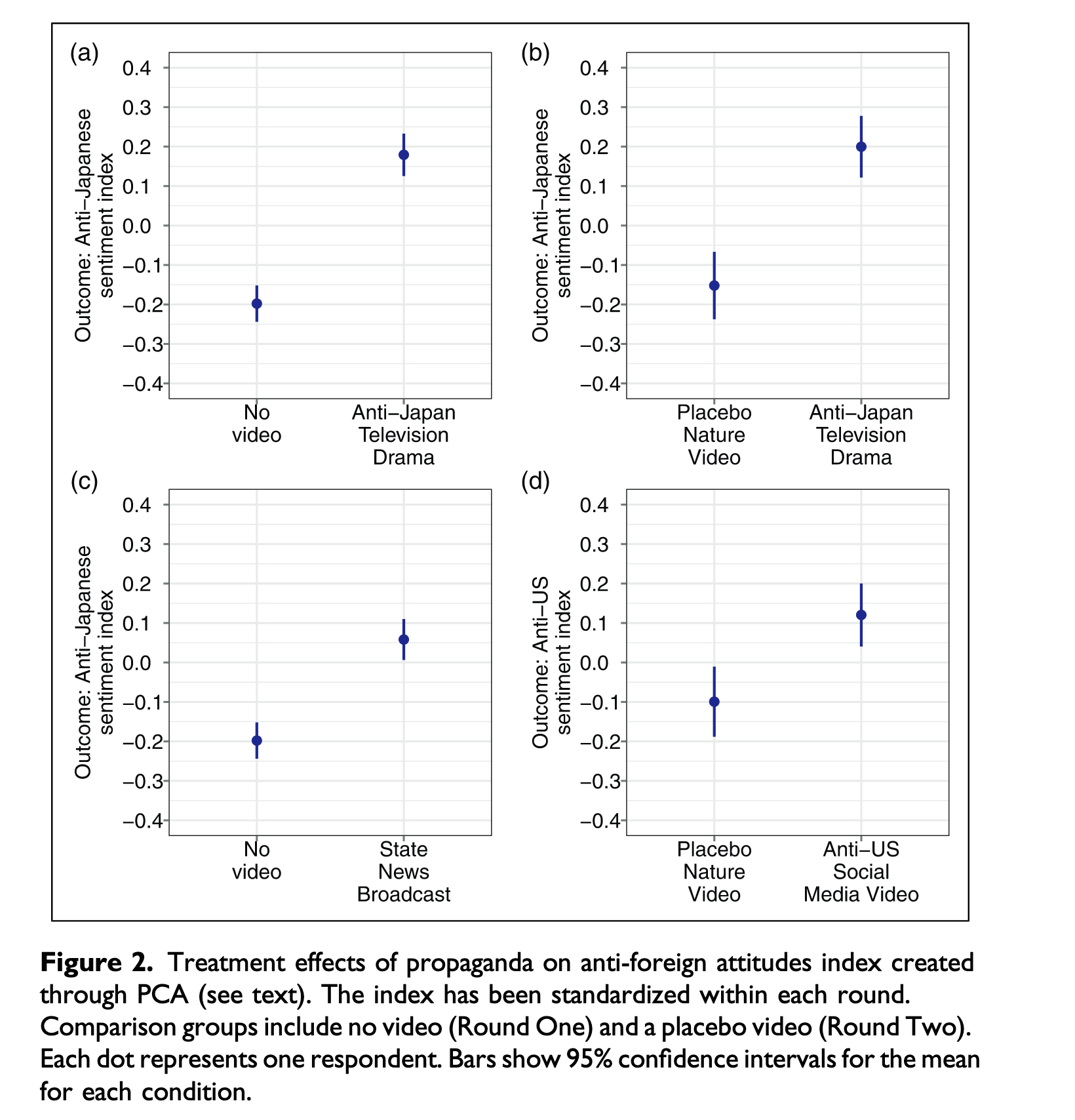 其中一个处理组观看了来自中共中央晚间新闻节目《新闻联播》的片段。该新闻报道聚焦于习近平出席一年一度的南京大屠杀国家公祭仪式,这是纪念抗战的三个公共节日之一。该视频在视觉与语言层面均强化了国家与党的象征及官方意识形态,因此可被视作硬宣传的例子。