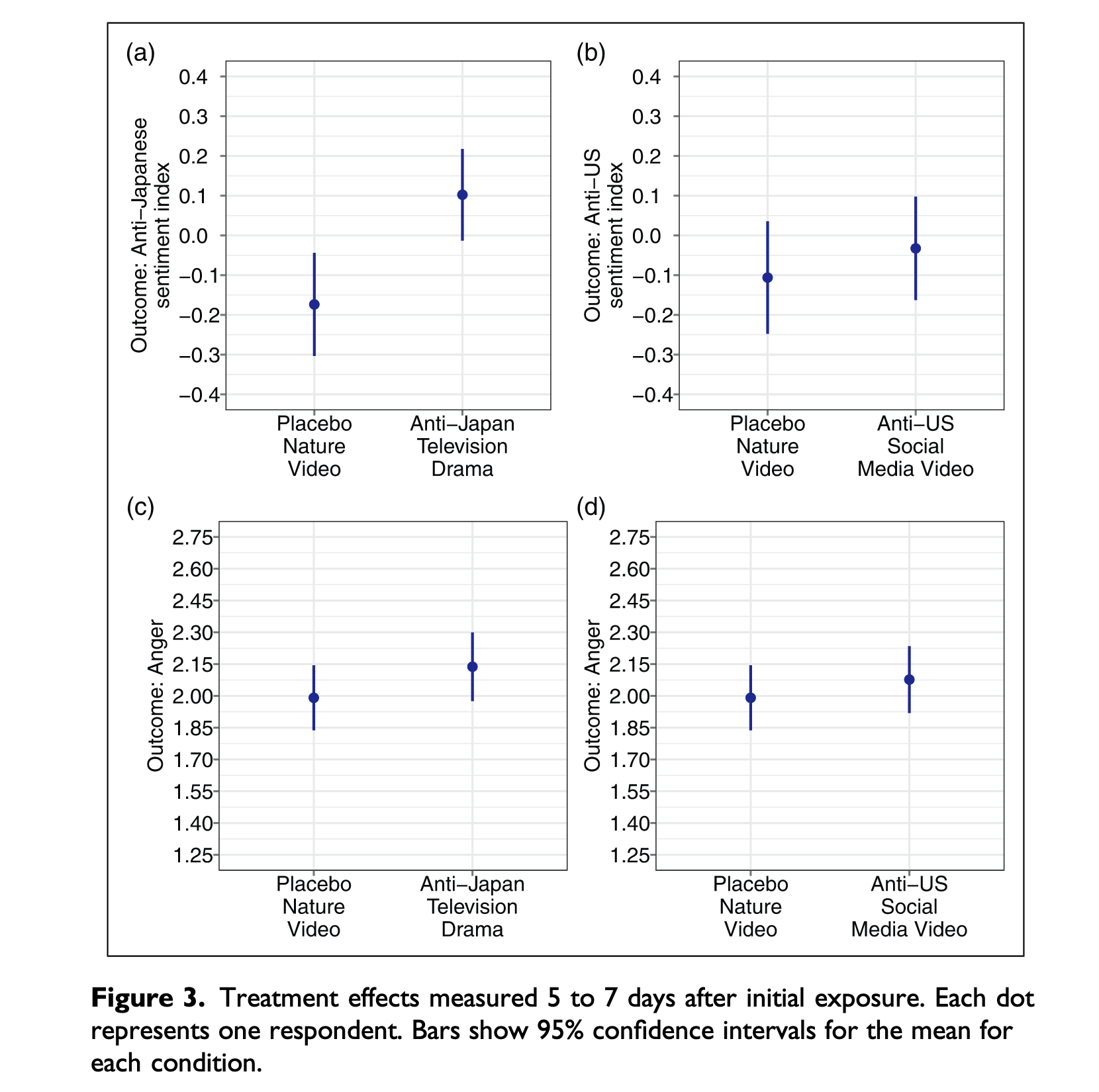 愤怒情绪通过让受访者按1到5分对当前的愤怒感受(”愤怒”)进行评分来测量。问题措辞借鉴了心理学研究中广泛使用的积极与消极情绪量表(PANAS)。我们特别关注”愤怒”,因为它是应对感知到的外国威胁时最关键的负面情绪。