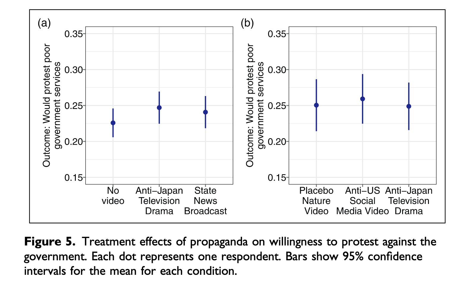 令人颇为惊讶的是,尤其与 Huang(2018)和 Carter & Carter(2021a)的研究相比,我们发现接触民族主义宣传并不会降低民众抗议政府的可能性。
