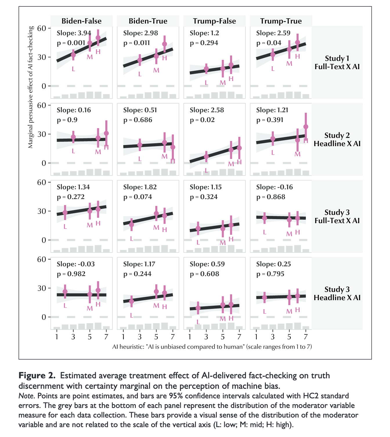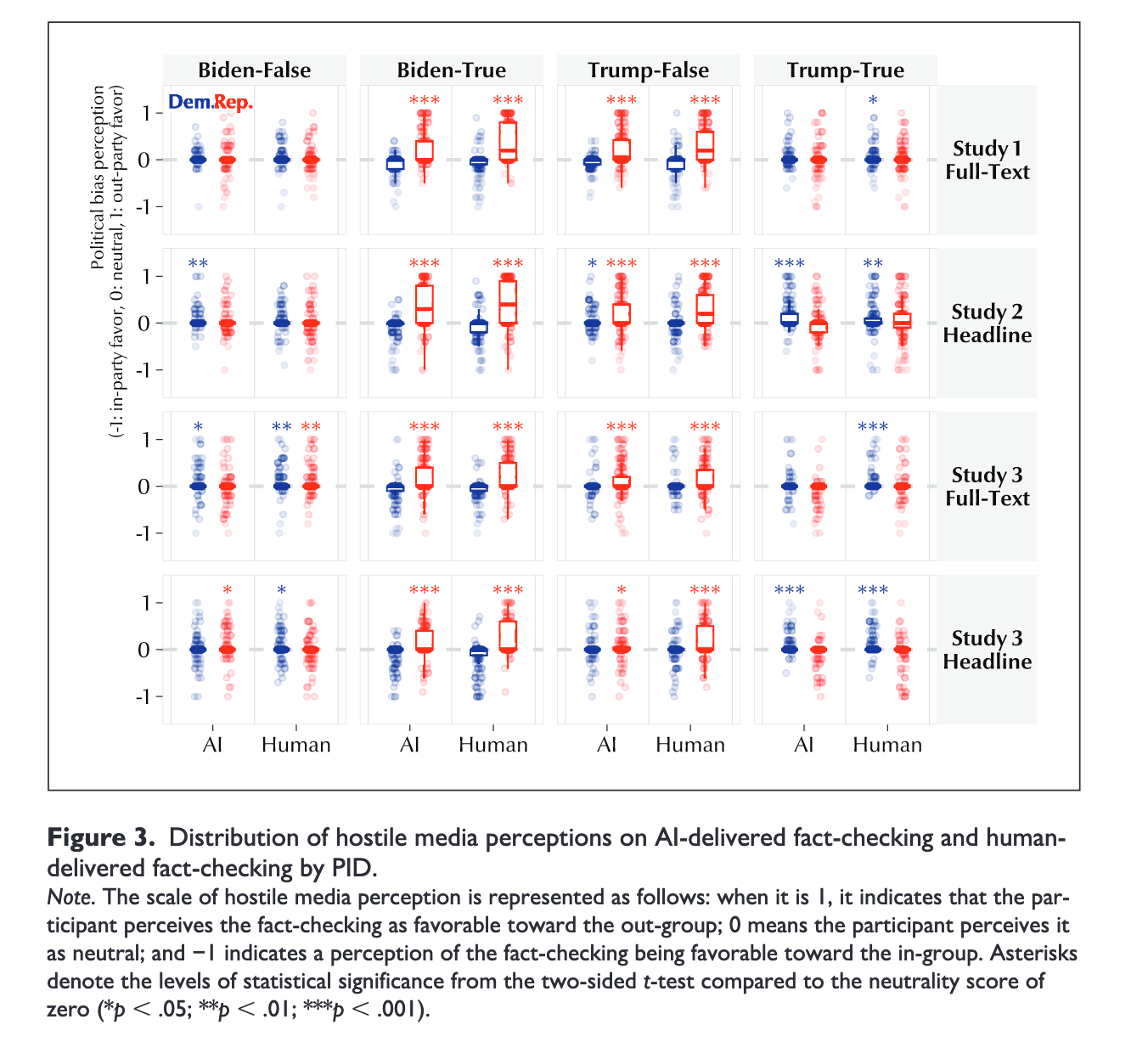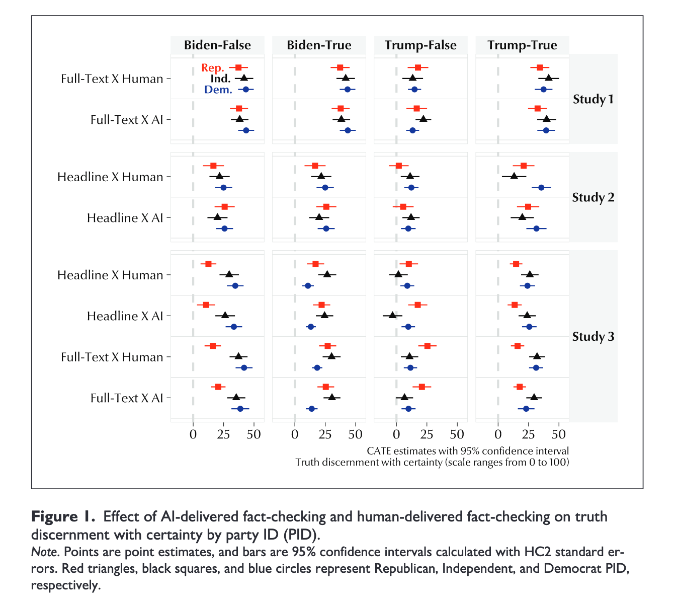 H2:来自与受众立场一致政党的事实核查比 AI 核查更具信任感,但其修正效果并不更优(可能因党派偏见而被折扣)。